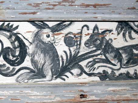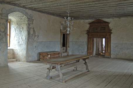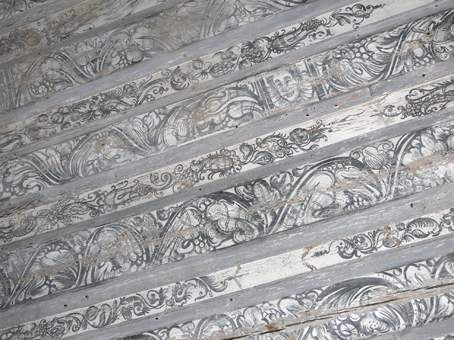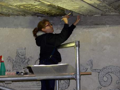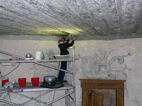 Konservering av limfärgsmålat bjälktak från tidigt 1600-tal med motiv målade i grisaille (gråtoner) på vit botten. Taket består av tättsittande bjälkar, med fyllningar av brädor en bräda längs med varje bjälke, brädorna vilar på profilerade lister. Taket är inte slätt, utan bjälkarna går längre ner än brädorna. Både bjälkar och brädor är dekorerade. Motiven består bl a av bladornamentik, vardagsscener, porträtt och djur.