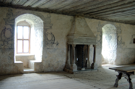 Torpa Stenhus är en av landets bäst bevarade enkelhusborgar från slutet av medeltiden. Riddarsalen ligger i husets äldsta del, som härstammar från 1400-talets slut och antas ursprungligen ha utgjort köket. Vid 1500-talets mitt byggs huset om och det är troligen då golvet i riddarsalen sänks avsevärt. Nästa stora om- och tillbyggnad sker i början av 1600-talet. Väggmotiven som idag dominerar rummet är sannolikt ursprungligen målade någon gång mellan 1550 och 1620. Det finns dock flera skikt varav det mest dominerande är det som ganska strikt följer det tidigare. Dateringarna är hur som helst osäkra. Hjortmotiven och det första skiktet när det gäller beslagsornamentiken i och runt fönsternischerna är samtida och utförda direkt på putsen.